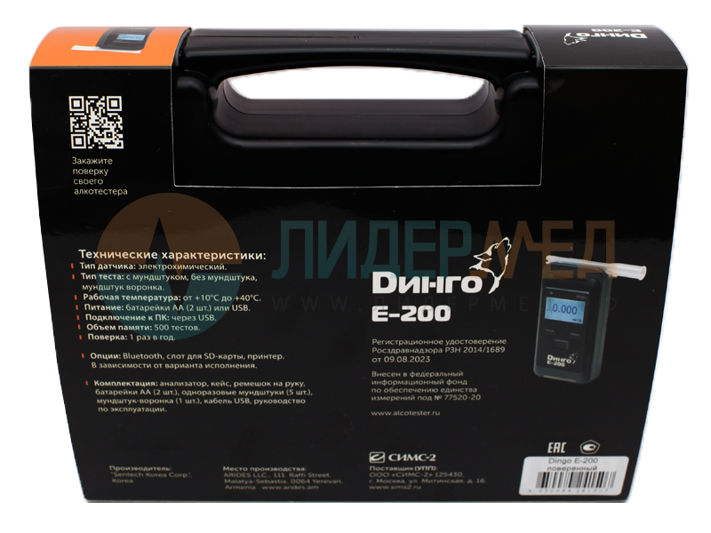 Медицинской анализатор предназначен для быстрого и точного измерения массовой концентрации паров этанола в выдыхаемом воздухе. Динго Е-200 оснащен электрохимическим сенсором с повышенной износоустойчивостью, может использоваться как для предсменного и предрейсового осмотра сотрудников, так и при наличии принтера для проведения медицинского освидетельствовании и освидетельствования в ГИБДД.