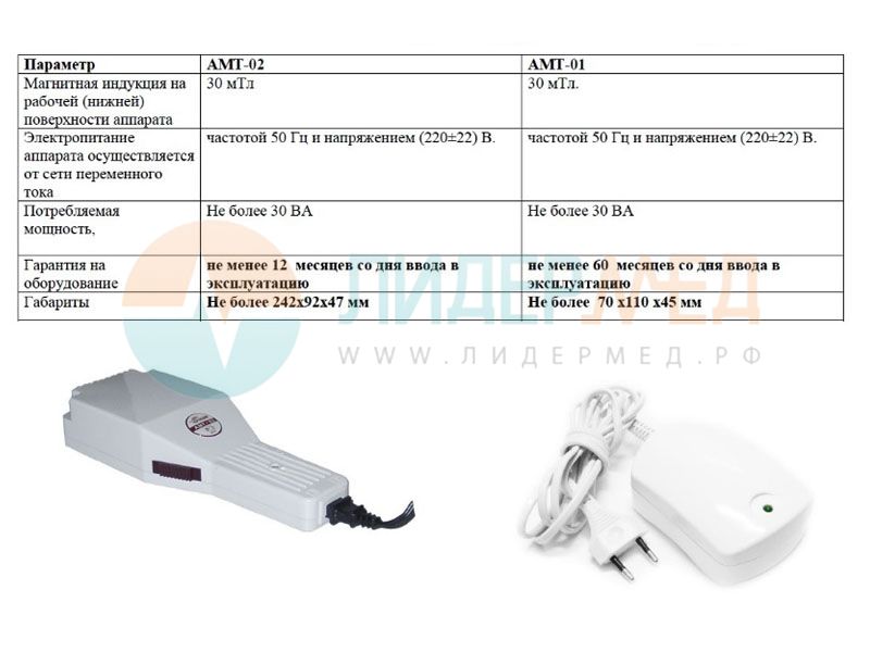Аппарат предназначен для лечения магнитным полем (нервная, кровеносная, эндокринная и пищеварительная системы, а также при травмах и переломах, снимает боли и воспаления). Аппарат АМТ-01 рекомендован Министерством здравоохранения для применения в лечебных учреждениях и домашних условиях.