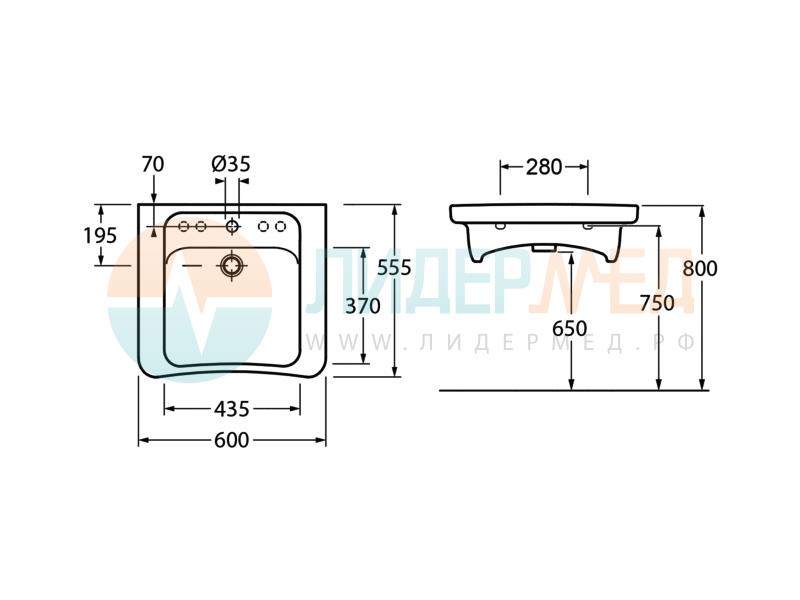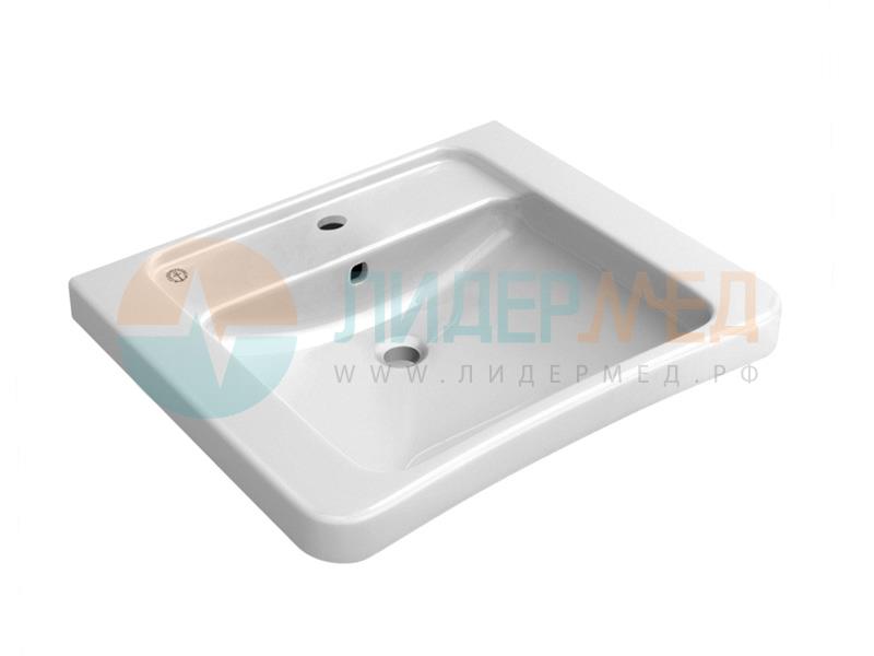 Подвесная раковина с вогнутым передним краем и удобными для захвата краями, предназначена специально для людей с ограниченными возможностями и для установки в медицинских учреждениях.