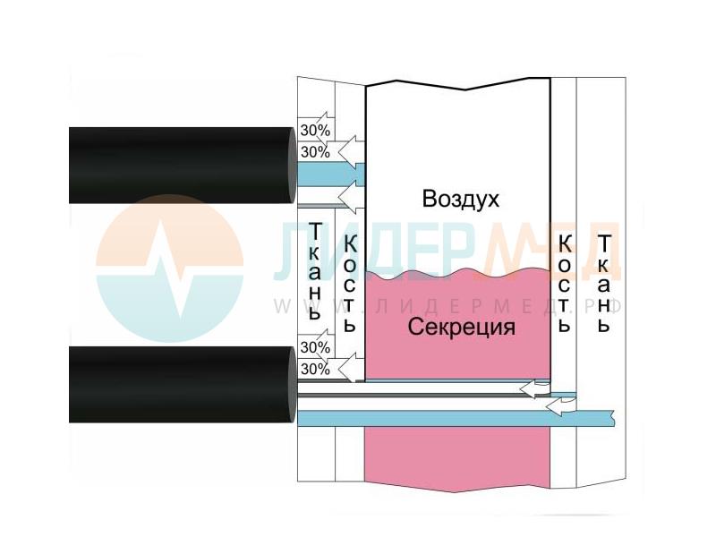 Коэффициент отражения ультразвука значительно отличается для разных границ раздела. На границе «кость/воздух ультразвук отражается полностью. На границе «кость/содержимое пазухи» ультразвук отражается частично, при этом часть энергии пересекает границу, далее происходит распространение в жидкости, к примеру, в гайморовой пазухе.