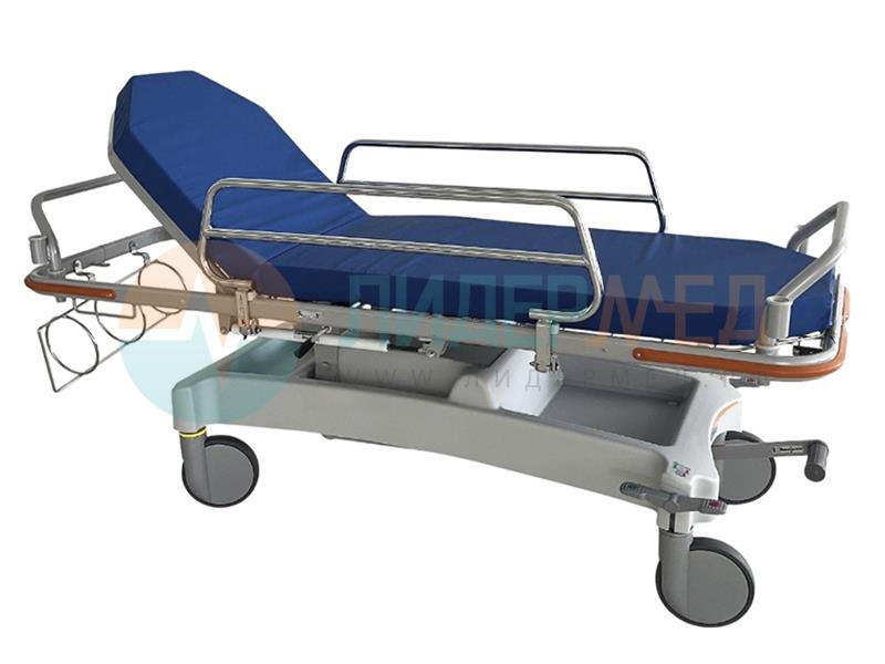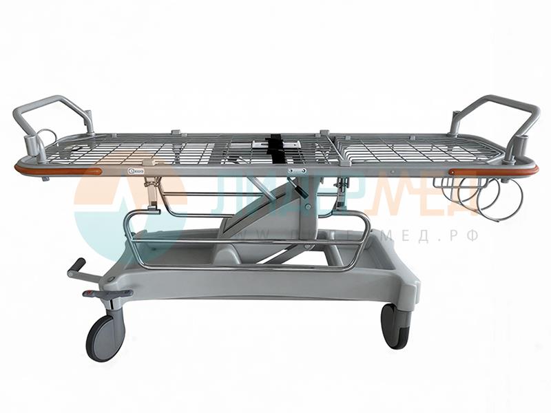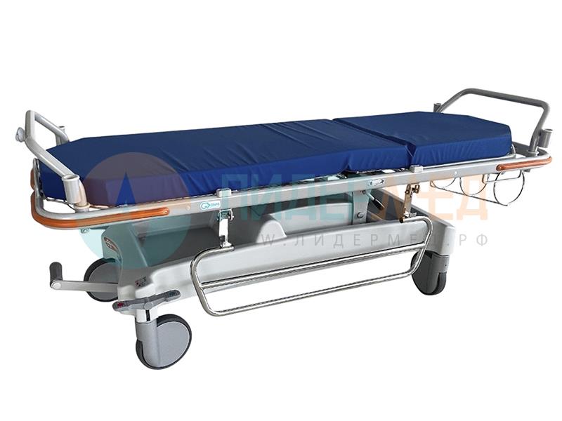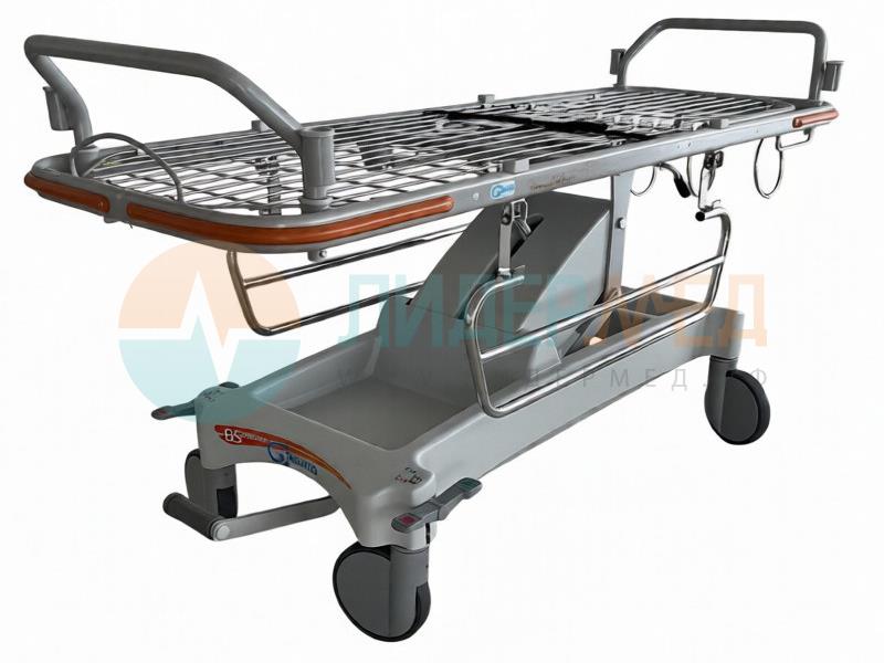 Медицинская каталка предназначена для безопасной и удобной транспортировки пациентов в лечебных учреждениях, отделениях скорой помощи, стационарах и диагностических центрах.гидравлическая регулировка высоты (ножная педаль со стороны ног пациента)подъемный механизм типа «пантограф»2-х секционное решетчатое ложе (съемное)пневматическая регулировка спинной секцииоснование каталки и подъемный механизм защищены картеромремень для фиксации пациентаугловые бамперына колесах с центральным тормозом, диаметром 200 мммаксимальный вес пациента 300 кг