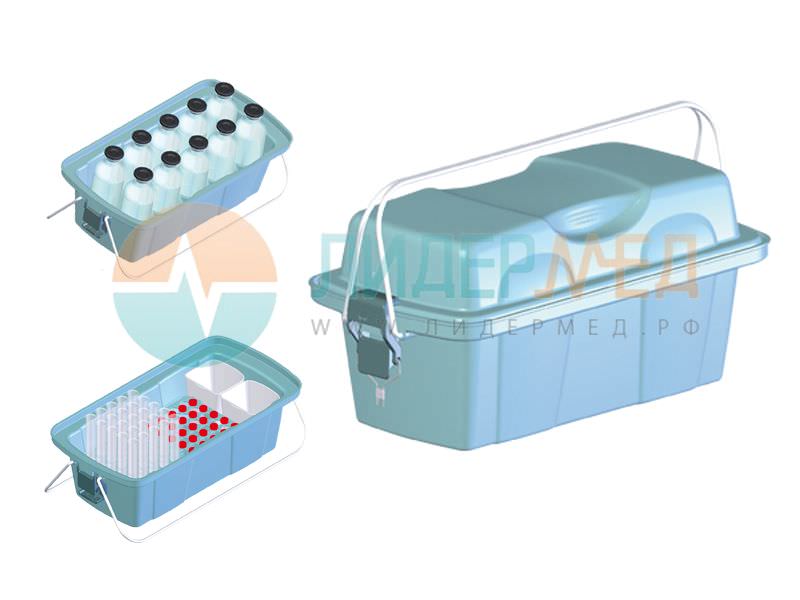 Укладка-контейнер полимерный представляет собой корпус с парой симметрично расположенных ручек и крышкой и предназначена для транспортировки и переноса пробирок и флаконов с биологическими растворами и другими жидкостями в различных лечебно-профилактических учреждениях.Обеспечивает санитарно-эпидемиологическую безопасность при транспортировке биологического материала внутри помещений и между отдельными корпусами в ЛПУ, на станциях переливания крови, СЭС и т.д.50 (100) пробирок или 10 флаконов 250 мл (банок).