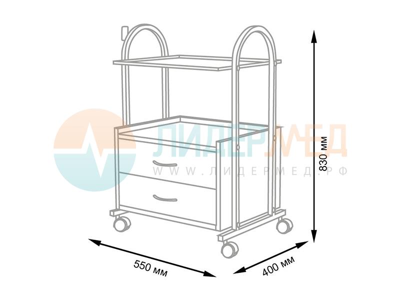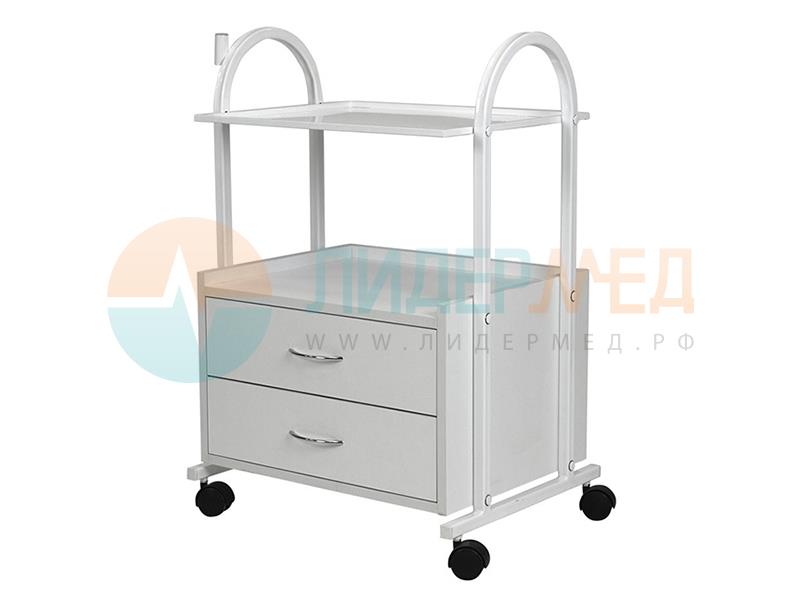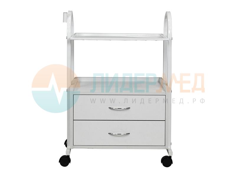 Тележка для косметологического или массажного кабинета. Вместительная и выдерживает достаточно большие нагрузки. Для размещения всех необходимых инструментов, приборов и расходных материалов. Каркас: металлический, белого цвета. Полка: металлическая, белого цвета. Колеса: чёрные пластиковые. Встроенный ящики: ЛДСП белого цвета, два ящика. Габаритные размеры: 830х550х400 мм.
