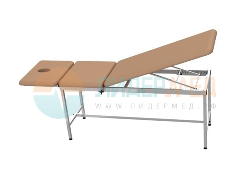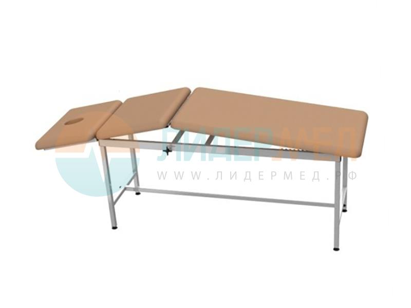 Кушетка состоит из трех секций. Регулируемый подголовник и секция для ног, устанавливается в положение «излом», «домик». Выполнена из высокопрочных материалов. Максимальная нагрузка до 300кг. Ножки стола при стандартной комплектации не оснащены колесами, но имеют возможность их установки.