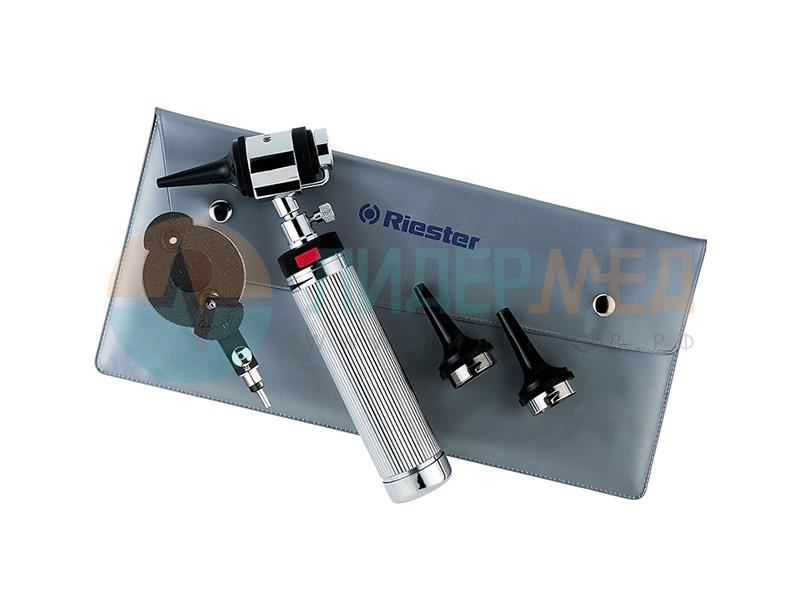 Отоскоп и офтальмоскоп в одном диагностическом наборе в мягком серебристом чехле. Комплект оснащен вакуумной или ксеноновой лампой, хромированной ручкой для батарей типа C. Сила света регулируется реостатом. Отоскоп: съемное защитное стекло, съемная поворотная x4 линза, 3 многоразовые воронки 2, 3 и 4 мм. Офтальмоскоп: корректирующие линзы от +20 до -20 диоптрий, с блендой большой круг.