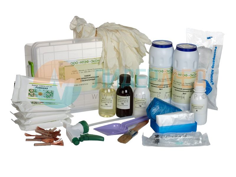 Лабораторный набор для демеркуризации предназначен для сбора разлива ртути в лабораториях и клиниках. В состав лабораторного набора для демеркуризации включены средства индивидуальной защиты и все необходимые реагенты для ликвидации разлива ртути на площади 50 - 60 кв. м.