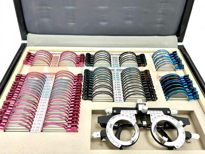 Комплект пробных очковых линз предназначен для обследования отклонений зрения: миопия, гиперметропия, астигматизм и пресбиопия, для обследования страбизма и цветовой слепоты. Также набор используется для подбора очков и линз. Набор пробных очковых линз укомплектован пробной универсальной оправой ОПУ и поставляется в кожаном чемодане.