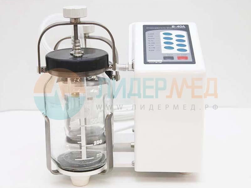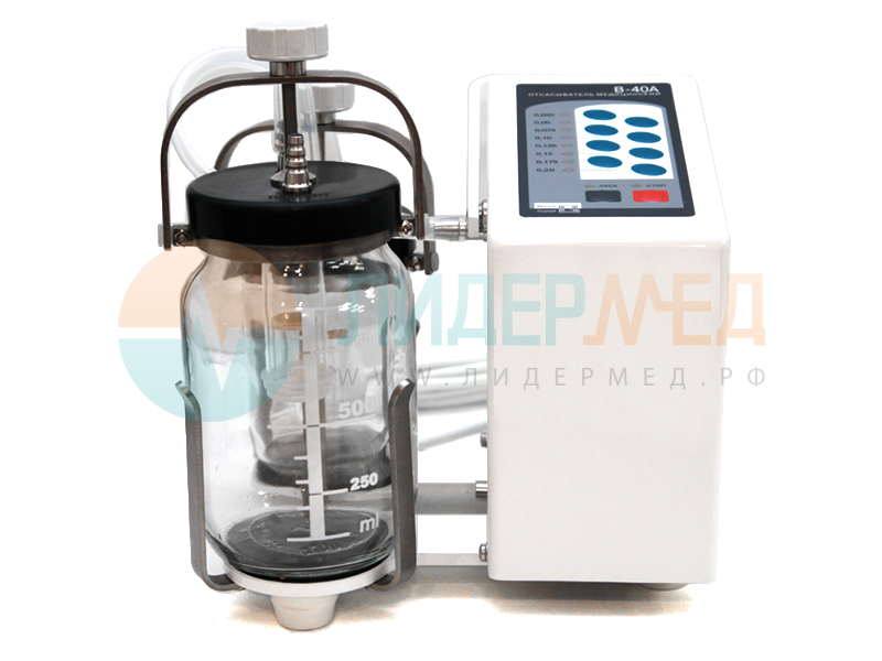 Медицинский отсасыватель В-40А предназначен для длительного (до 5 суток и более) отсасывания жидкости и газов из плевральной полости (дренаж). Рекомендован к применению для очистки раневой поверхности в абдоминальной и сосудистой хирургии, гнойной хирургии мягких тканей, туловища и конечностей. Также при активной лапаростомии у больных распространенным гнойным перитонитом для аспирации жидкости из брюшной полости с использованием устройства для активной аспирации жидкости из брюшной полости.