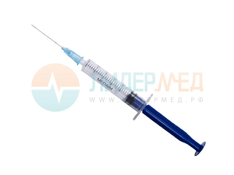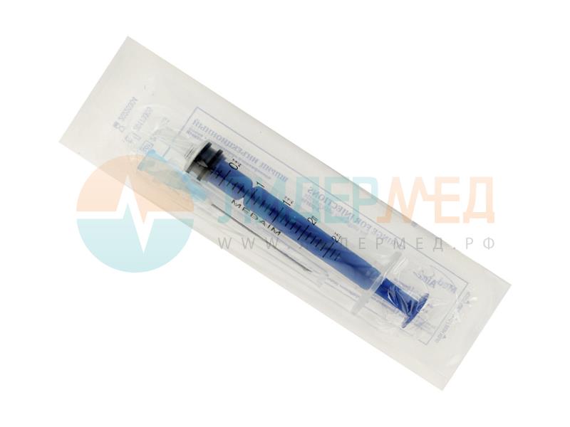 Шприц одноразовый, стерильный, трехкомпонентный с резиновой уплотнительной манжетой на поршне. Игла из нержавеющей медицинской стали марки SUS304 с трехгранной копьевидной заточкой.
