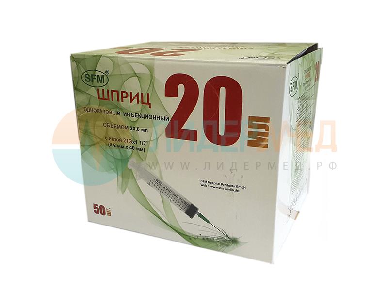 Объем – 20 мл Трехкомпонентный – цилиндр, поршень, манжета. Размер иглы G/мм – 21G (0,80х40 мм) Первичная упаковка – 50 шт. Транспортная упаковка – 600 шт.11 кг, 37*43*43. 0,068 м³ Производство – SFM Hospital Products GmbH, Германия