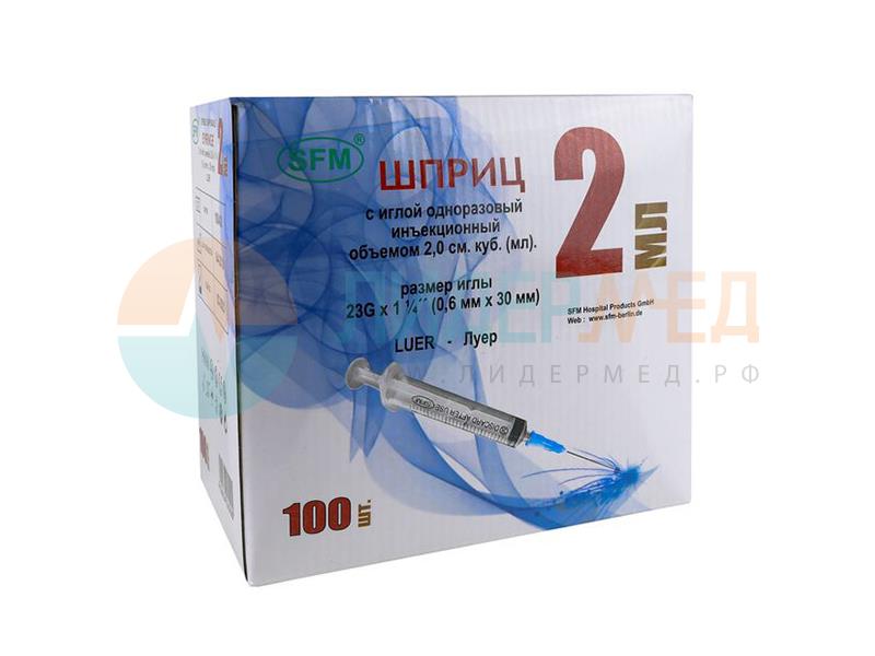 Объем – 2 мл Трехкомпонентный – цилиндр, поршень, манжета. Размер иглы G/мм – 23G (0,63х32 мм) Первичная упаковка – 100 шт. Транспортная упаковка – 2400 шт., 13 кг, 37*49*59; 0,010 м³ Производство – SFM Hospital Products GmbH, Германия