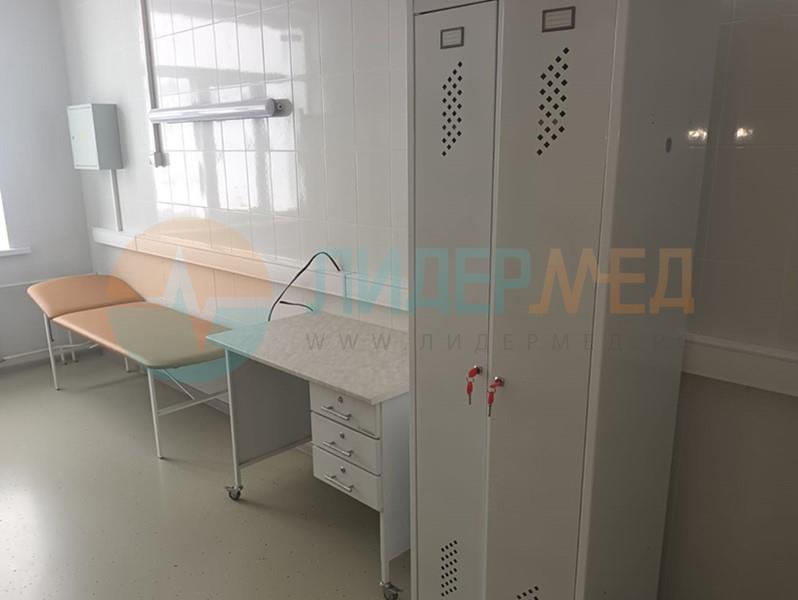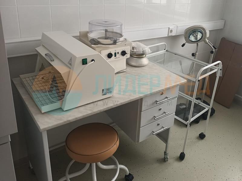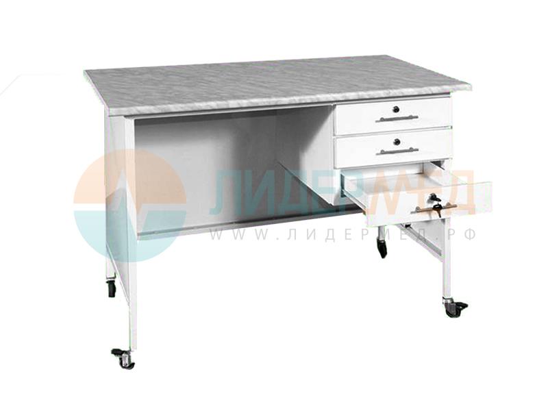 Стол медицинский предназначен для оснащения кабинетов в медицинских учреждениях. Выполнен с применением прочной сборно-сварной металллоконструкции и листового металла, покрытых порошковой эпоксидной краской, с химовлагостойкой столешницей, под которой расположена тумба с тремя ящиками. Каждый ящик с замком. На регулируемых металлических ножках или на четырех колесах, два из которых снабжены тормозами. Размер: 1100х600х790 мм.