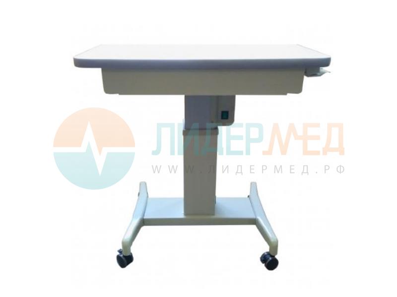 Стол моторизованный регулируемый по высоте приборный стол для офтальмологического кабинета, а также для размещения на нём приборов и оборудования в медицинских кабинетах и лабораториях. Управление регулировки подъема стола расположено на блоке управления под столешницей.