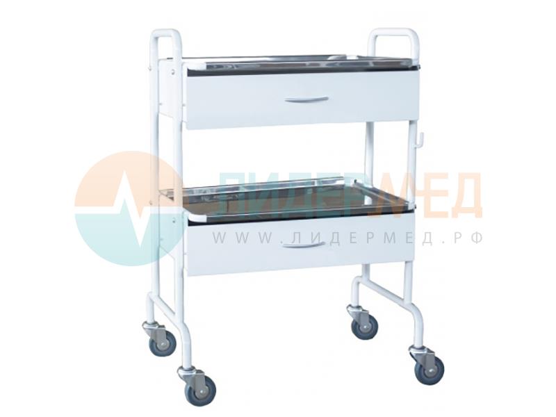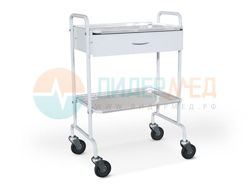 Столик предназначен для размещения медикаментов и инструментов в медицинских кабинетах. Варианты исполнения: СМм-3: 2 полки нерж., 1 ящик; СМм-3: 2 полки нерж., 2 ящика.