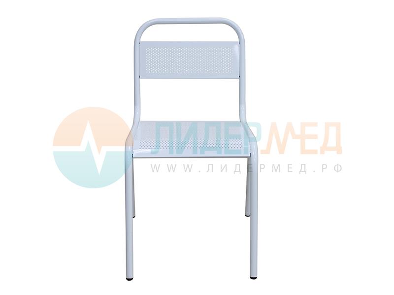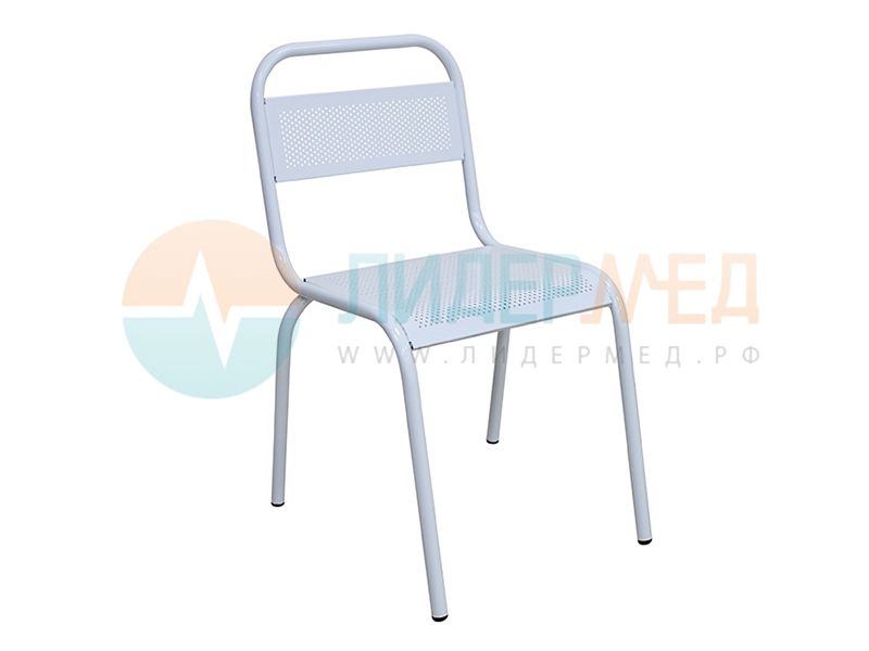 Металлический стул с перфорированными сиденьем и спинкой предназначен для медицинских учреждений. Цвет: белый, черный, металлик.