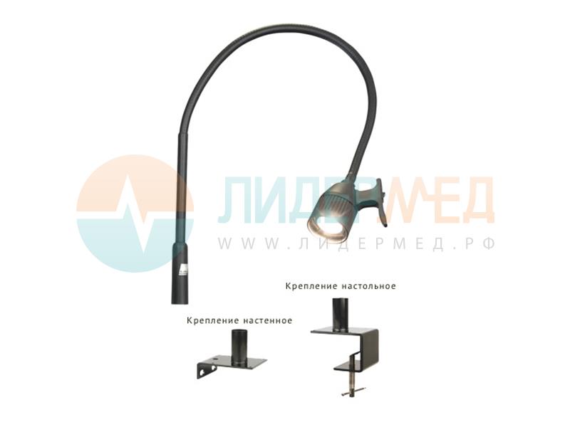 Галогенный светильник с настольным/настенным креплением с гибкой частью лампы позволяет осветить рабочее поле под любым углом наклона, оптимально выбранное положение отлично фиксируется благодаря надежному «гусю». Предназначен для кабинета гинеколога, уролога, отоларинголога, офтальмолога, как дополнительный источник света при малоинвазивных операциях.