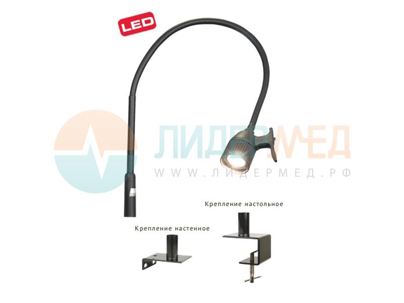 Медицинский светильник с настольным/настенным креплением с гибкой частью лампы позволяет осветить рабочее поле под любым углом наклона, оптимально выбранное положение отлично фиксируется благодаря надежному «гусю». Предназначен для кабинета гинеколога, уролога, отоларинголога, офтальмолога, как дополнительный источник света при малоинвазивных операциях.