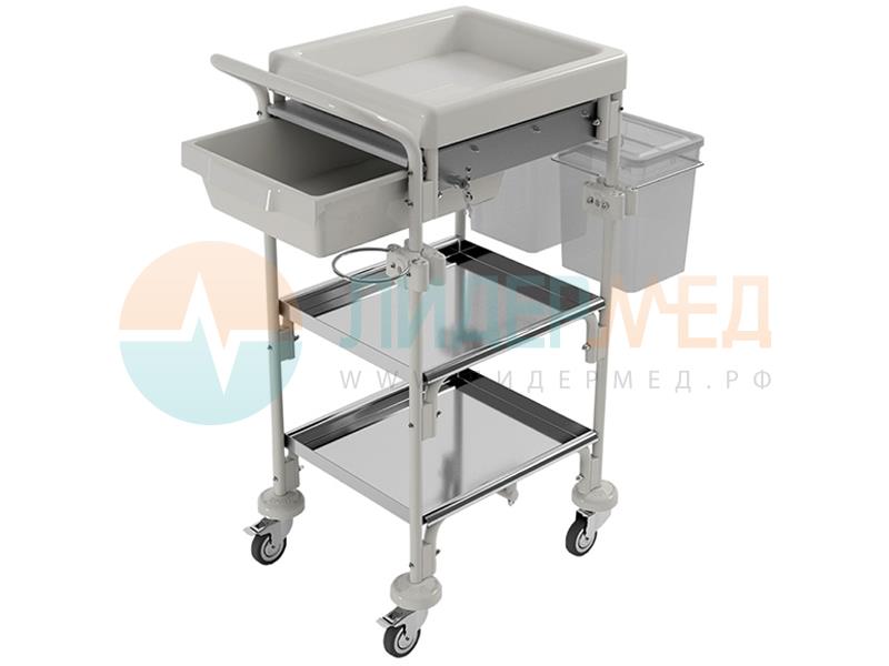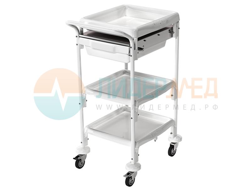 Тележка медицинская с ручкой предназначена для размещения медицинских изделий, выполнения услуг инвазивных вмешательств в условиях ЛПУ.1 выдвижной ящик с замком. 3 поддона.
