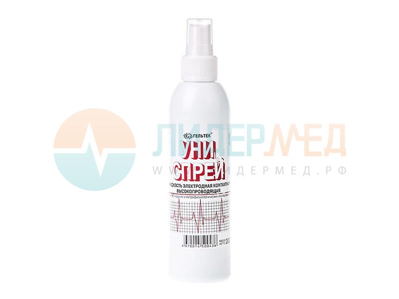 Жидкость электродная контактная высокопроводящая для ЭКГ и других электрофизиологических исследований "Униспрей" 0,2 кг. Является универсальным экономичным электролитом, позволяющим оперативно проводить диагностические исследования.