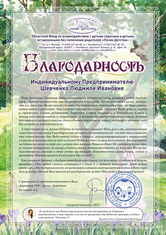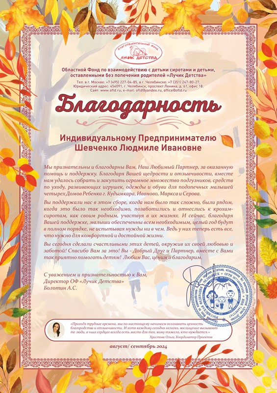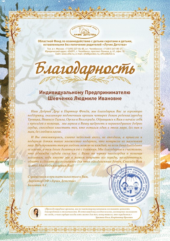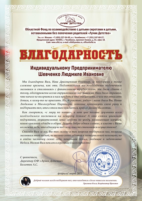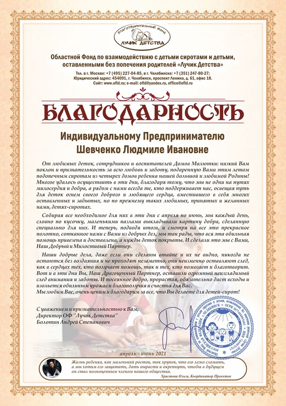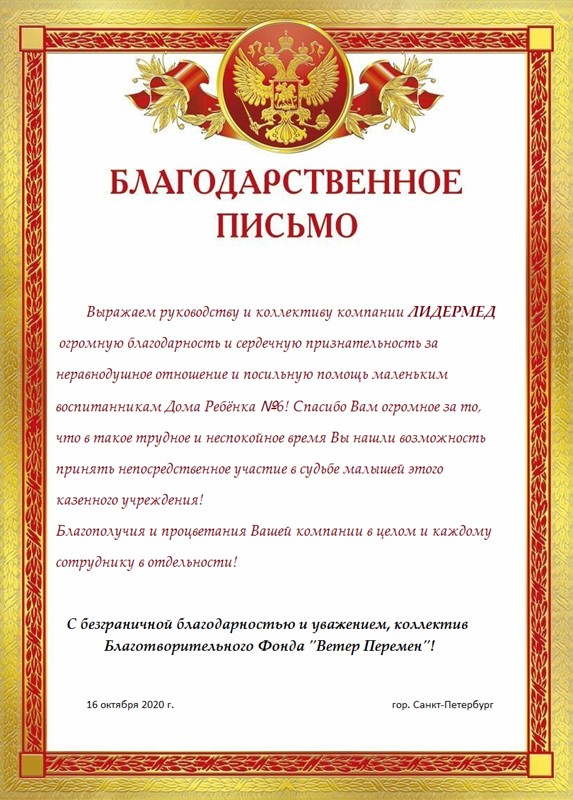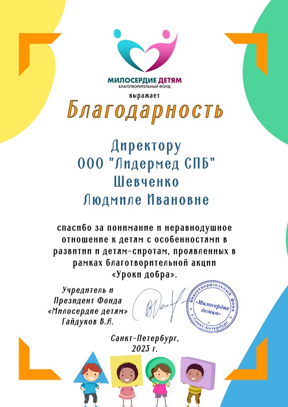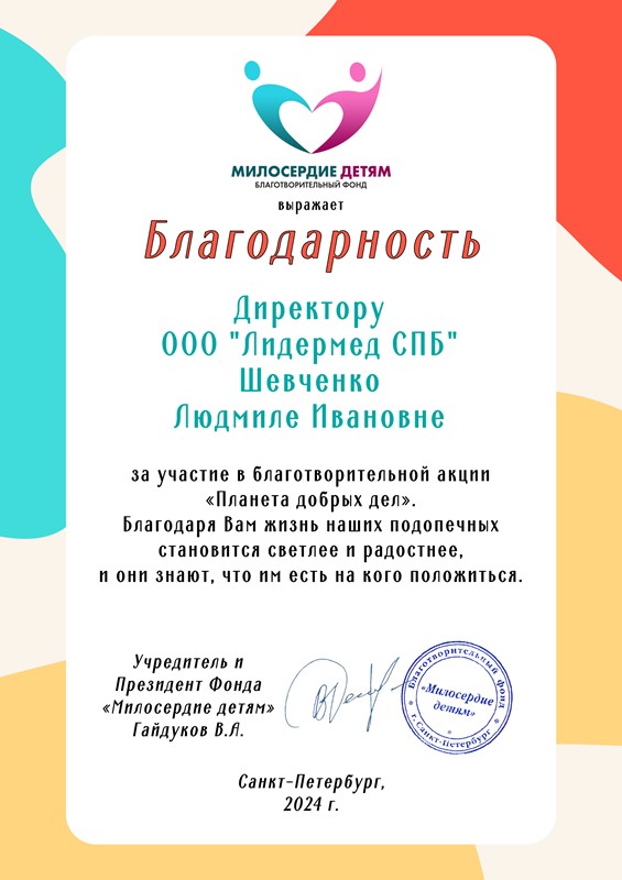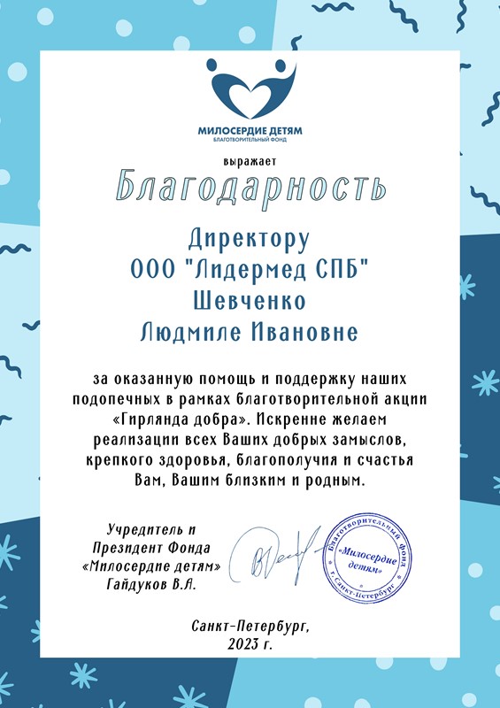 Компания ЛИДЕРМЕД оказывает поддержку детским домам, школам-интернатам и другим организациям, независимо от их деятельности, а также региональным благотворительным фондам.